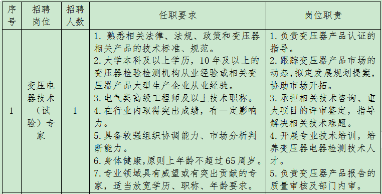 現(xiàn)根據(jù)公司經(jīng)營發(fā)展需要,面向社會(huì)招聘變壓電器技術(shù)(試驗(yàn))專家、高壓技術(shù)(試驗(yàn))專家,有關(guān)事項(xiàng)通告如下。
